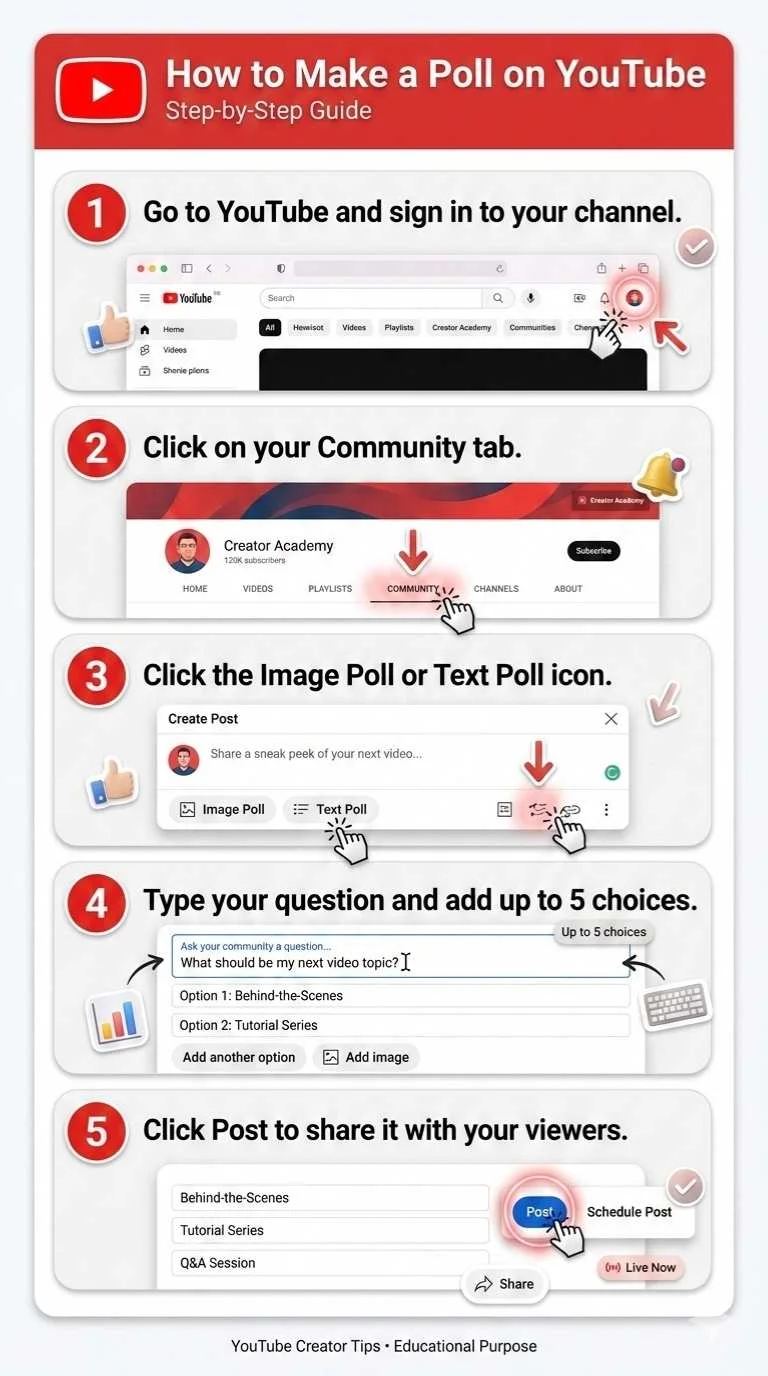 If you want to know how to do a poll on youtube using a computer, follow these simple steps. It takes less than a minute.